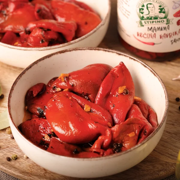 Mamina pečena paprika je salata koju najviše volimo. Očišćenu pečenu papriku stavljamo u smjesu od ulja, octa, soli, šećera, češnjaka te zeru bibera.